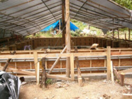 いよいよ明日は第二回の生コン打ちです。 型枠も立派に完成しました。明日はポンプ車も入って生コン3リューベ。 長い間お世話になったこの屋根も明日撤去します。